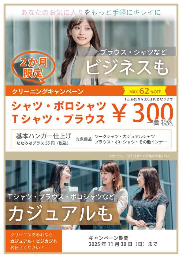 クリーニングキャンペーン:対象製品「シャツ・ポロシャツ・Tシャツ・ブラウス」などのインナー製品が一律300円(税込み)