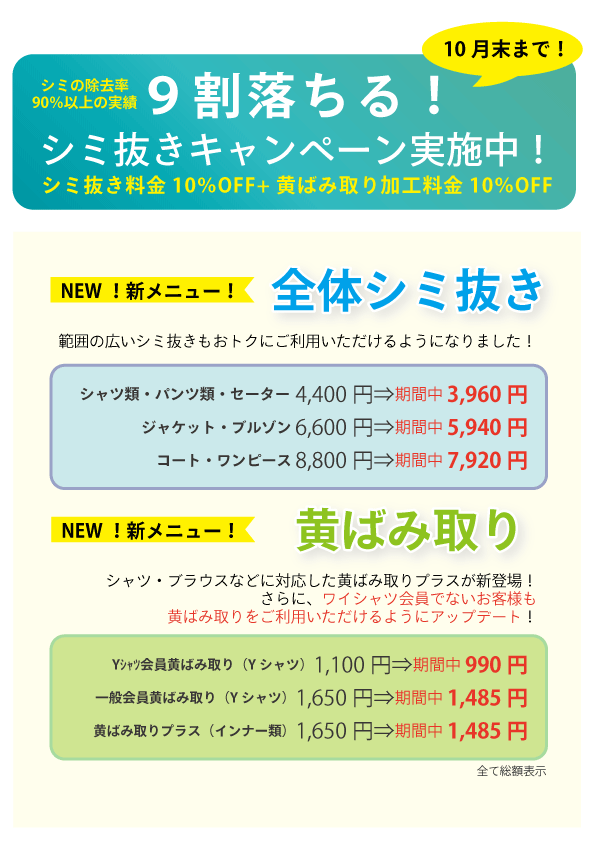 【10月はシミ抜きがお得!インナーキャンペーンと組み合わせてもっとおトクに!】