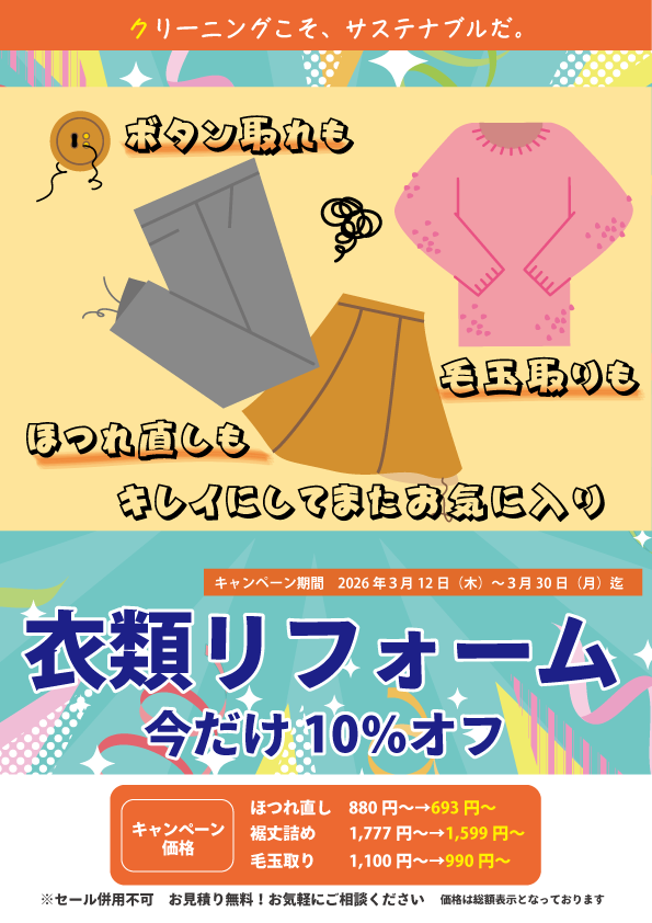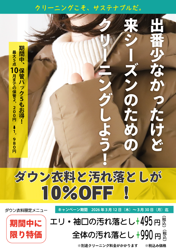 ダウン衣料クリーニングが10%OFF、衣類のリフォームが10%OFFになる大変お得なキャンペーンを開催しております^^